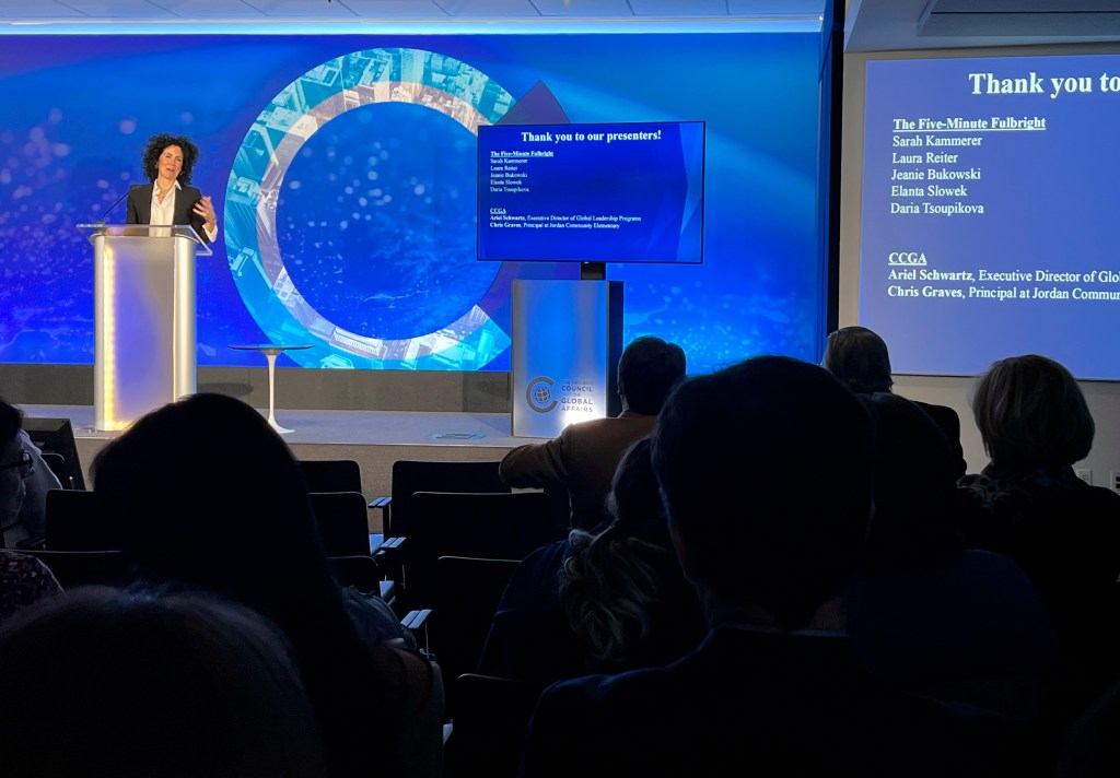 ON THURSDAY, MARCH 6, 2025, over 150 guests gathered at the Chicago Council on Global Affairs for the annual Extravaganza. Overlooking Millennium Park, this high-energy event celebrated intercultural learning and professional growth. A major highlight was the “Five-Minute Fulbright” session, where five scholars—including Sarah Kammerer and Daria Tsoupikova—delivered rapid-fire presentations on their global projects.