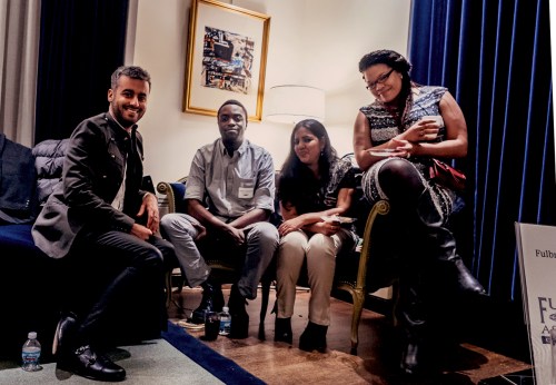 Current Fulbright students attending Columbia College Chicago. From left to right, Cyril Bassil (Lebanon,) Calisto Lemashon (Kenya,) Shreya Singh (India) and Melissa M. Jiménez (Trinidad and Tobago.)