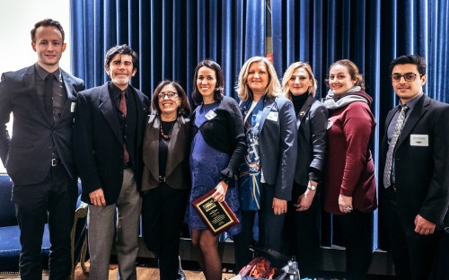 Left to right, the organizing Holidays event and Dee Sarelas Committee: Kevin Spitta, Elio Leturia, Marilyn Sussman, 2016 Dee Sarelas awardee Cristina Sisson, Mary Mares-Awe, Teuta Peja, Meredith McNeal and Yasir Al-Ibrahem. Ron Harvey (not pictured) could not be present since he is teaching in Bulgaria.