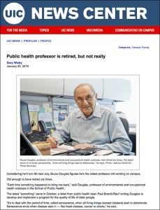 In July of this year, Bruce celebrated his 90th birthday. He was invited to return to the UIC School of Public Health in October of 2014, to which he commutes three days a week as Professor of Health and Aging; and he has also been reappointed Professor of Oral Medicine at the College of Dentistry. He has recently published a compendium of his work on the subject of “the older worker,” which is a field in which he has published and lectured widely.