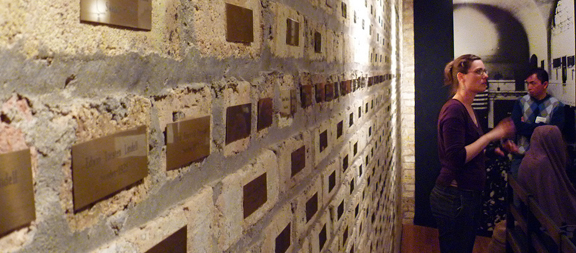 Education Director Jessie Aucoin showing the wall where names of Swedish immigrants are engraved on plaques
