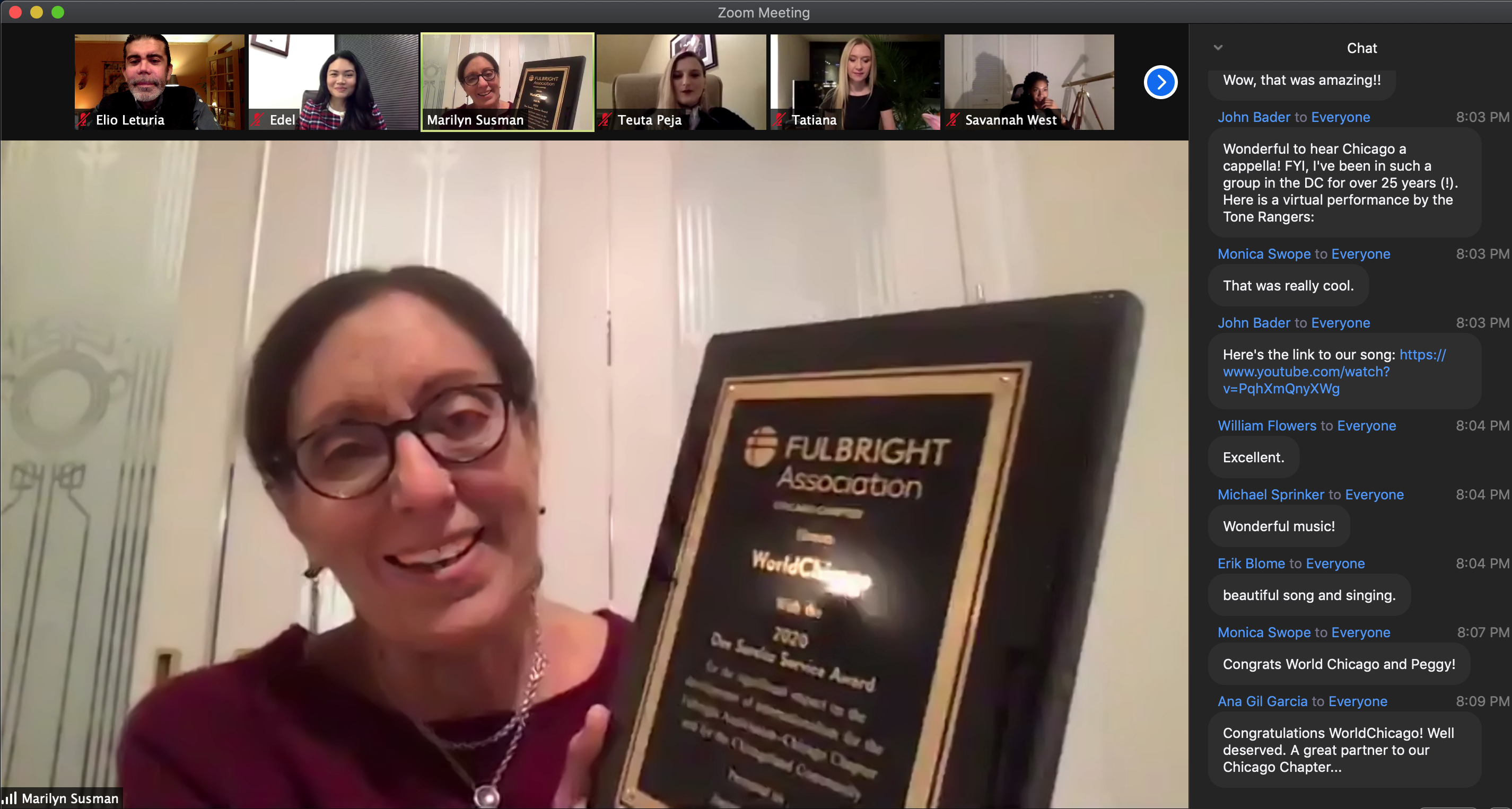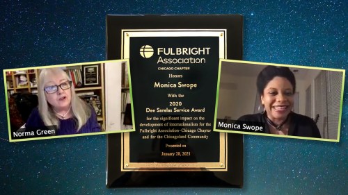 By Suzanne McBride—DOZENS OF FULBRIGHTERS gathered virtually Jan. 28 to honor the 2020 Dee Sarelas Service Award recipients that included a past chapter president and a local group the Chicago chapter has partnered with over the years, and they got an update on the Fulbright program from the association’s national leader.