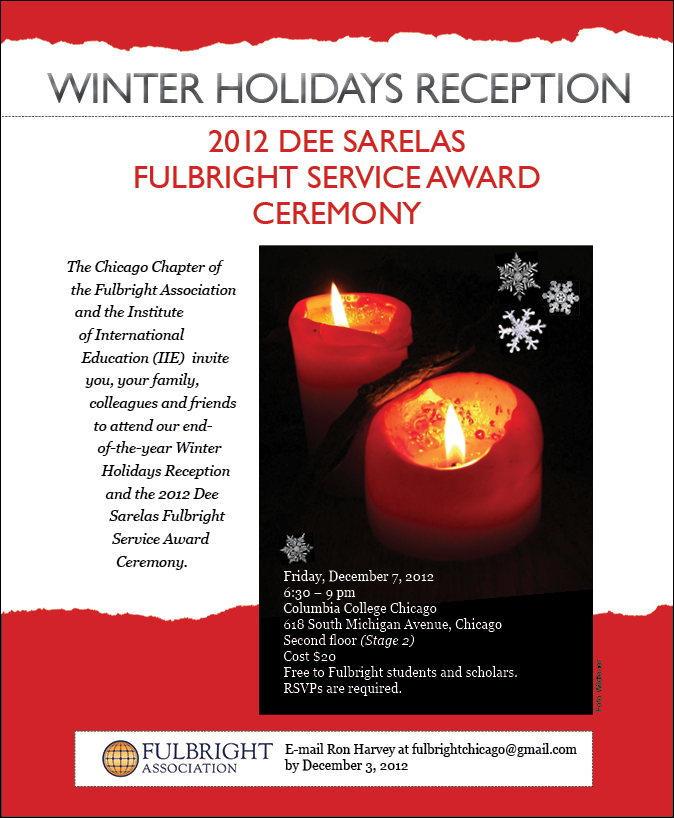 *A Chicagoan dedicated to interacting with and nurturing Fulbrighters in the Chicago area community, Dee was a person remembered for her wit, empathy, and vivacity in bringing people across cultures together. The Chicago Chapter has established the Dee Sarelas Fulbright Service Award in her memory to honor those who follow Dee’s example for service. Please join us in honoring Dee and the Fulbright legacy by submitting a nomination for 2014.