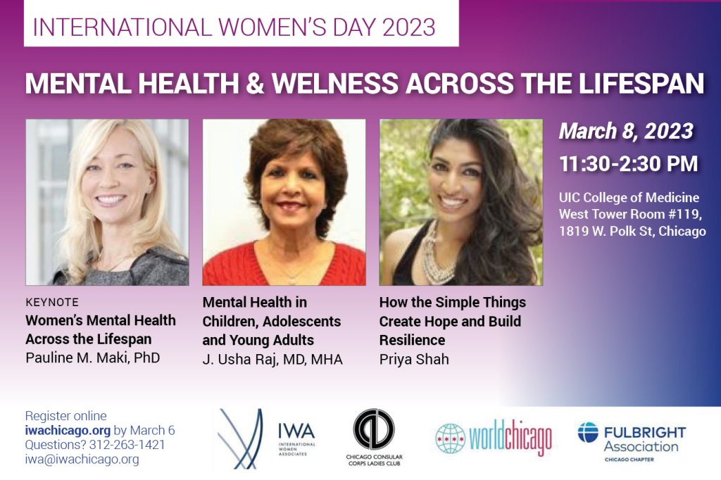 Join us for an enlightening and engaging discussion about mental health issues for all ages. We will hear about disparities and the innovative work being done in addressing them. Learn about the importance of early recognition, intervention, and prevention. Our dynamic speakers, Pauline M. Maki, J. Usha Raj, and Priya Shah will inform us about what we need to know for our own as well as our loved ones’ lifelong mental wellbeing.