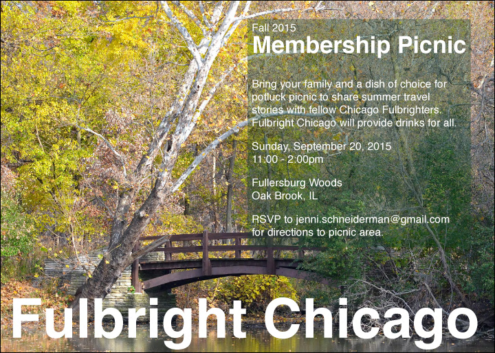 Fulbright_Picnic_Fall2015THE CHICAGO CHAPTER of the Fulbright Association invites you, your family and friends to share food and fun in the great outdoors! The Fullersburg Woods is one of DuPage County’s premiere nature areas with winding trails along the creek and a working mill that dates back to the 1800’s.